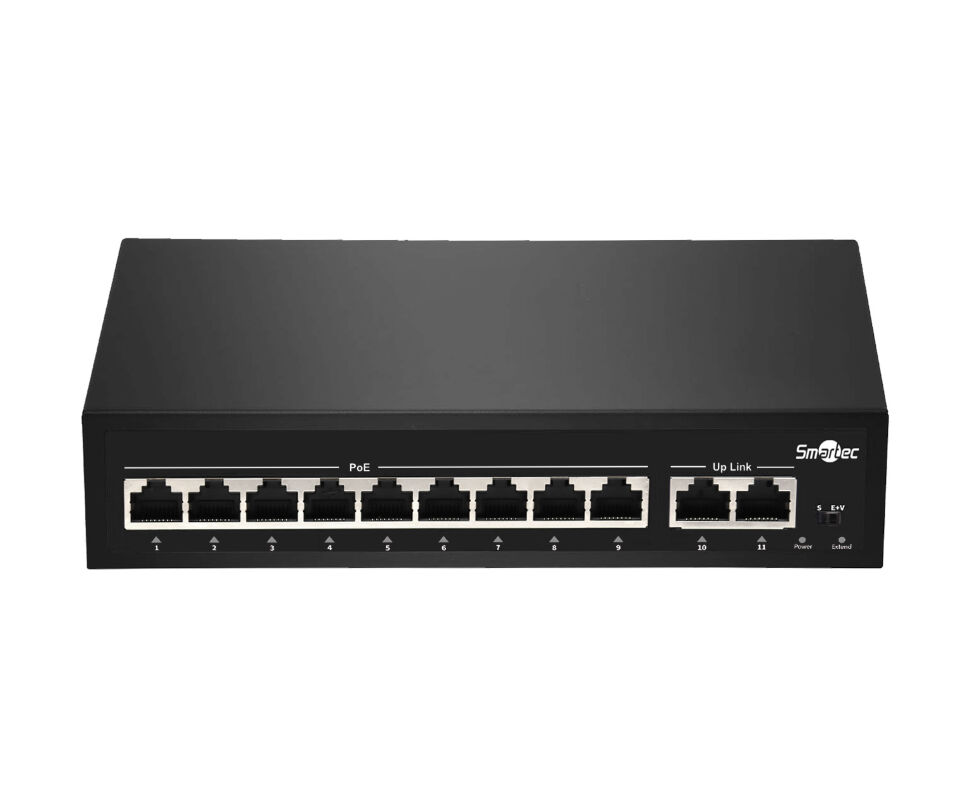 Неадминистрируемый коммутатор, 9 RJ-45 POE портов (10/100 Мбит/с), 2 RJ-45 Uplink порта (10/100 Мбит/с), бюджет на порт до 30 Вт, общий бюджет до 120Вт.