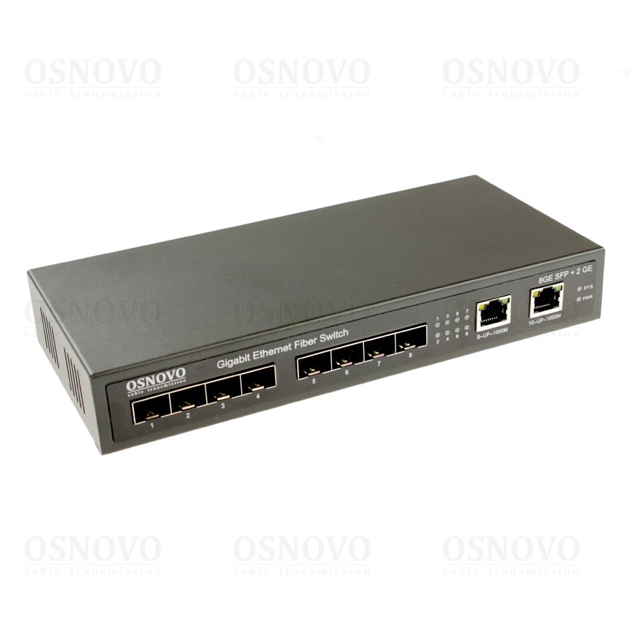 Сетевой коммутатор Gigabit Ethernet на 8 SFP + 2 RJ45 портов. Порты: 8 x GE SFP (1000Base-FX), 2 x GE (10/100/1000Base-T). Поддержка режима изоляции портов (VLAN). В комплекте БП DC12V (2A). Размеры (ШхВхГ): 225 х 35 х 105мм. Рабочая температура: -10…+55°С.