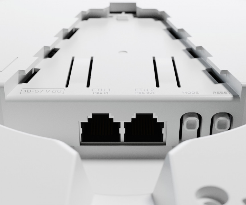 Несмотря на поддержку радиомодулем режима репитера, два гигабитных Ethernet-порта позволяют расширить сеть с помощью кабелей, даже если потребуется PoE-питание: cAP XL ac обеспечивает питание по стандартам PoE 802.3af/at на первом порту и раздачу Passive PoE (до 57 В) на втором.