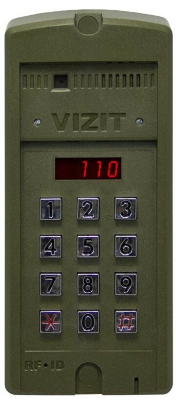 (100 индивидуальных кодов, 600 ключей VIZIT-RF3). Светодиодный дисплей. Подсветка клавиатуры. Корпус блока выполнен из ударопрочного поликарбоната, стойкого к атмосферным воздействиям.