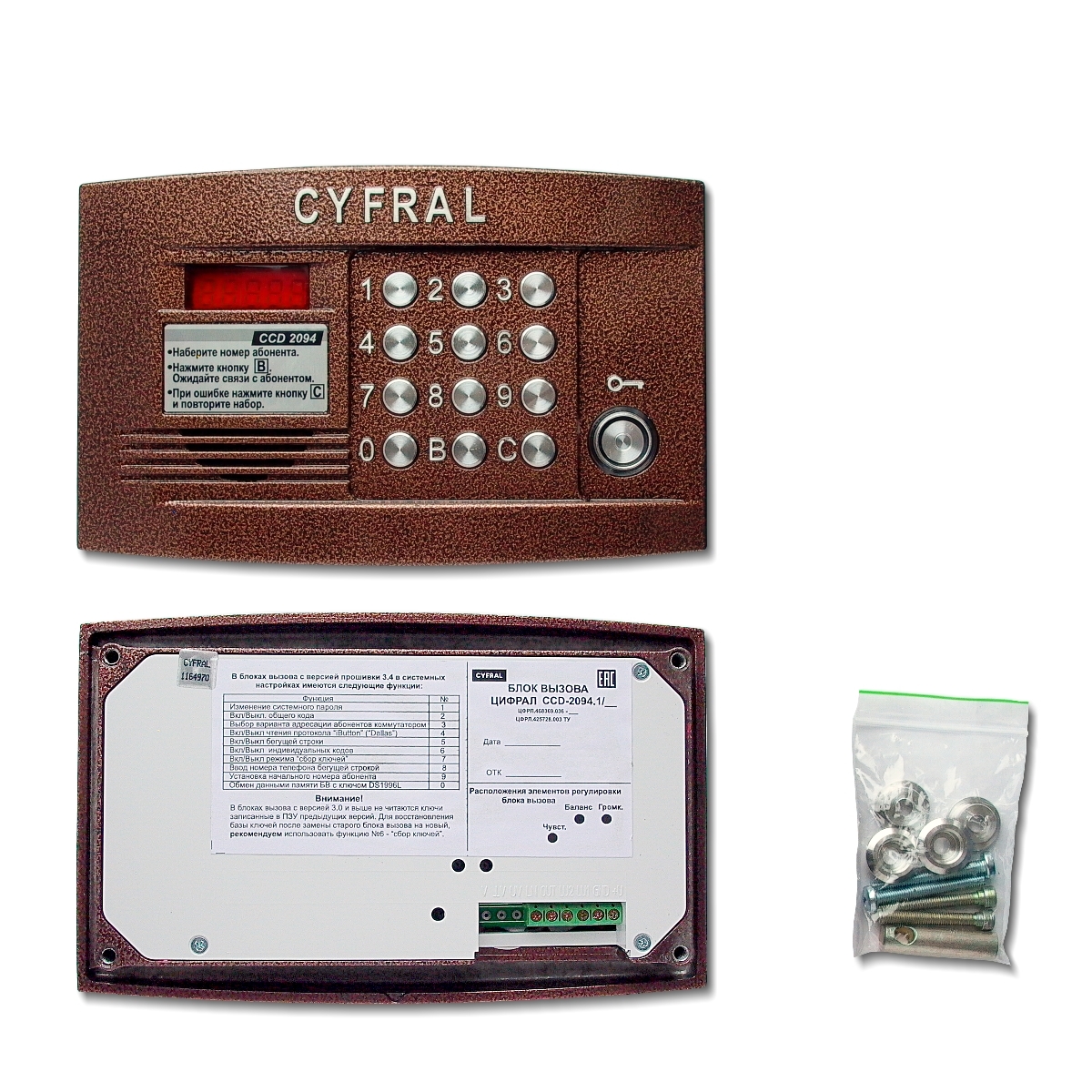 Блок вызова ЦИФРАЛ CCD-2094.1 БЛОК ВЫЗОВА АУДИОДОМОФОН до 200 абонентов и до 400+ абонентов (Cyfral) - До 100 абонентов по координатной линии связи с использованием коммутатора КМГ-100; до 200 абонентов по координатной линии связи с использованием 2-х коммутаторов КМГ-100; до 100 абонентов по двухпроводной линии связи с коммутатором КМГ-2; встроенный считыватель и контроллер на 1500 ключей «Touch Memory Cyfral» (DC-2000А), «Dallas DS1990A»; подсветка клавиатуры.