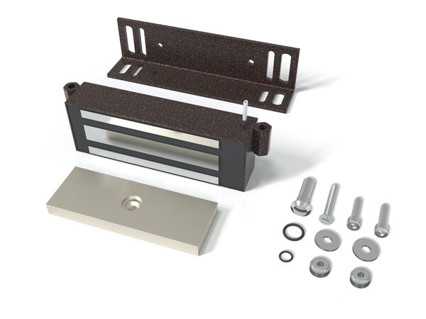 Замок электромагнитный (напряжение питания 9-15VDC, потребляемая мощность не более 7,2 Вт, усилие удержания 300кг), встроенный модуль перемагничивания, монтажный комплект, угольник 40х50х4мм. Корпус из стали. Цвет Антик Медный.