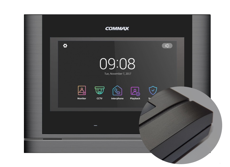 Commax CDV-70MF VZ — сенсорный LCD монитор видеодомофона 7.0" AHD. Разрешение экрана1024х600, вызов аудио/видео (при наличии камеры) от координатного подъездного домофона +3-х вызывных блоков.Управление 3 эл/мех./магн.замками. Автоматическая запись видео и фото при вызове, запись по детектору движения. Память MicroSD до 256Гб. Охранные функции. Питание осуществляется переменным током напряжением 100-240В, 50/60 Гц. Цвет: Черный/Темное Серебро
