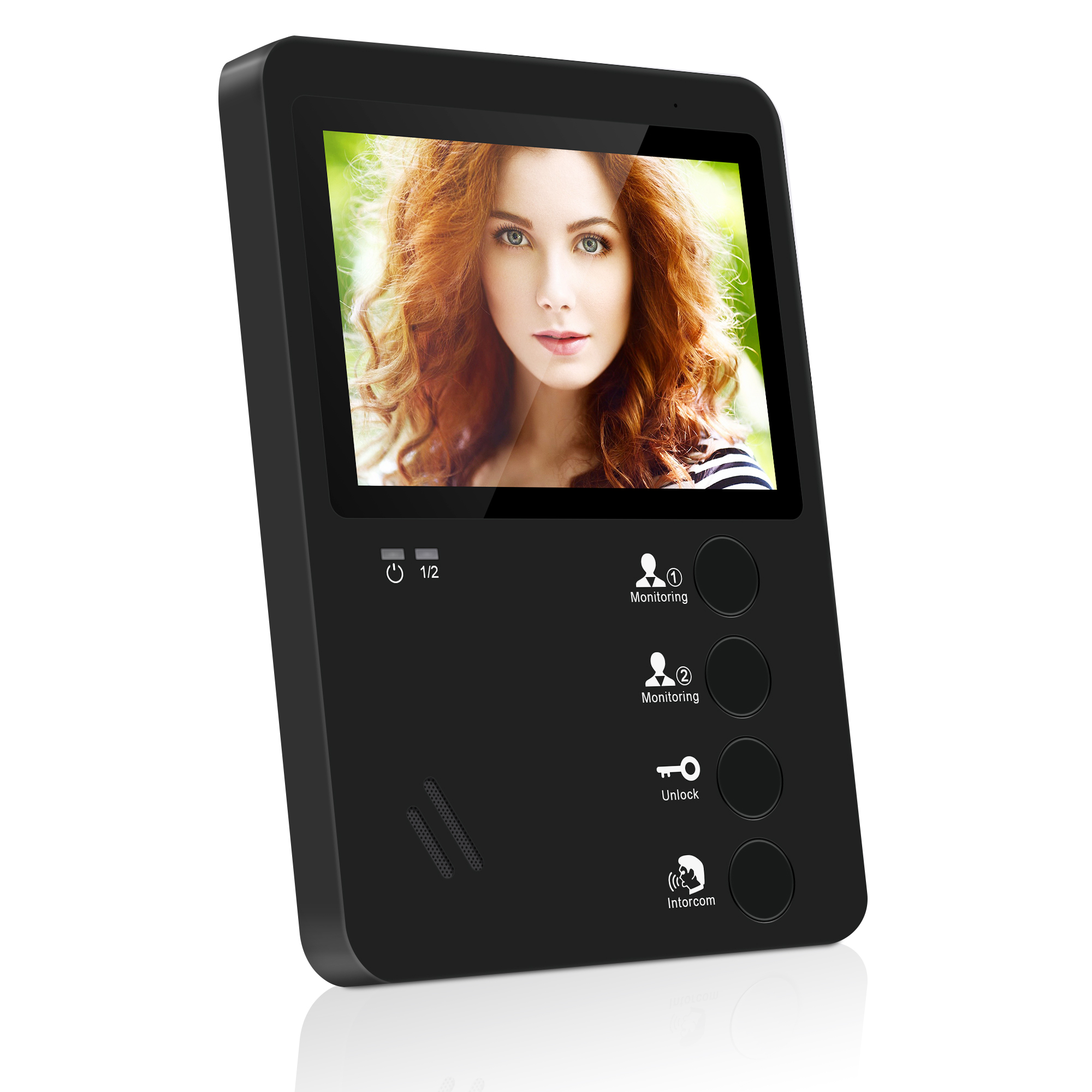 Экран 4,3 дюйма, механические кнопки. Подключение 2-х вызывных панелей, PAL/NTSC. Регулировка громкости звонка, разговора, яркости. Дополнительный разъем для внешнего БП DC 12V, Габариты 120x20x170 мм. Вес 550 гр. Цвет черный, Блок питания встроенный AC100V~240V