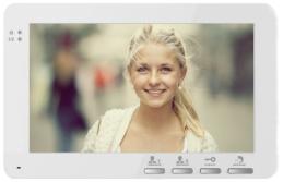 Экран 7 дюймов, механические кнопки. Подключение 2-х вызывных панелей, PAL/NTSC. Регулировка громкости звонка, разговора, яркости. . Дополнительный разъем для внешнего БП DC 12V. Габариты 195х120х20 мм. Вес 950 гр. Блок питания встроенный AC100V~240V, цвет белый