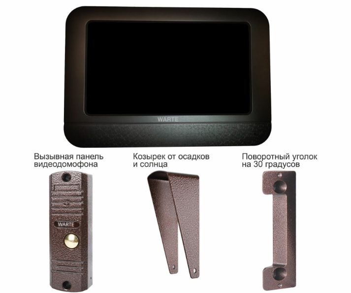 Комплект видеодомофона WARTE-07-01 черный/медь из одного 7” видеодомофона WARTE-DM7-01 черный и одной вызывной панели WARTE-DP-01 PAL медь. Поддерживает подключение до 2 вызывных панелей PAL / видеокамер в режиме CVBS + одного дополнительного видеодомофона WARTE-DM7-01 + автоматика для ворот. Вызывная панель медного цвета 600твл и углом обзора 90 градусов, с козырьком и уголком, управление эл. замками.