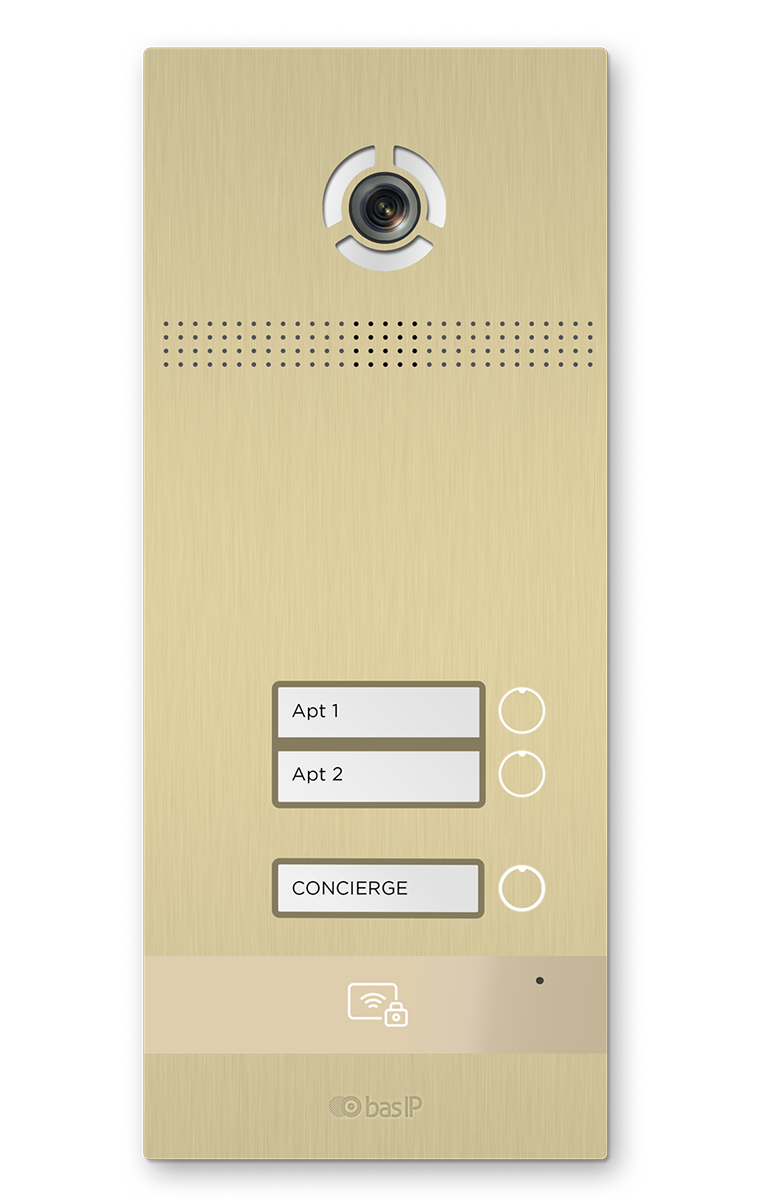 Уникальная вызывная панель на 2 абонента в стильном дизайне.BI-02FB доступна в золотом, серебряном и черном цветах. Она оснащена широкоугольной камерой и поддерживает мобильный доступ BAS-IP UKEY.
