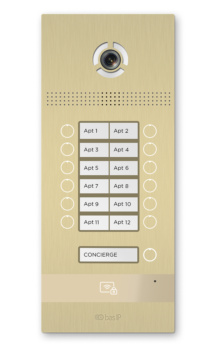 Многокнопочная IP вызывная панель на 12 абонентов с 3D распознаванием лиц. BI-12FB доступна в золотом, серебряном и черном цветах.