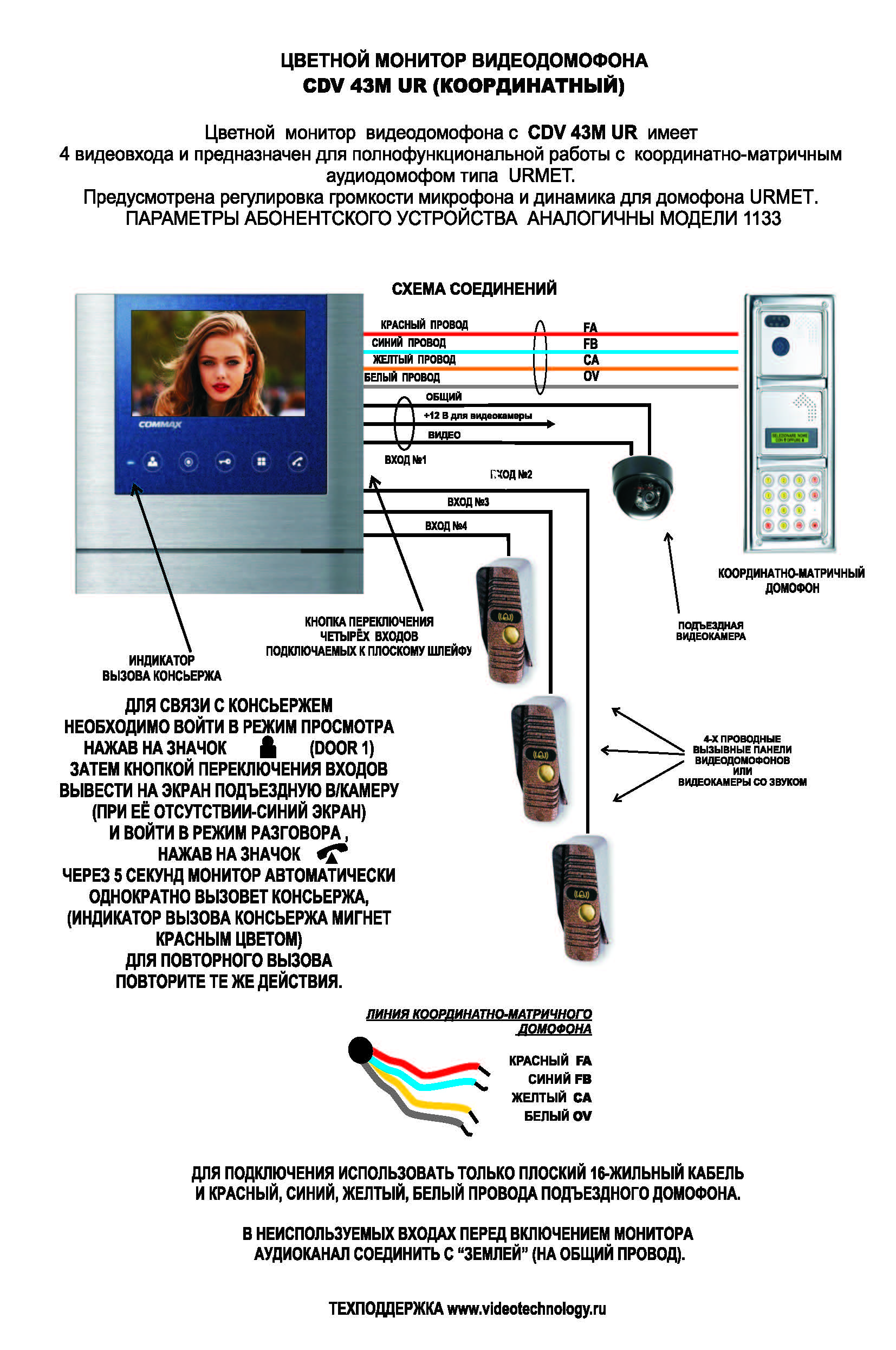 COMMAX CDV-43M Metalo (Белый) Цветной видеодомофон Встроенный блок сопряжения с URMET-1038. Цветной видеодомофон без трубки, 4,3 дюйма PAL/NTSC, LCD TFT с LED-подсветкой подключение 3-х вызывных панелей цвет: синий питание: 100-240 В, 50/60 Гц. температурный режим: от 0 до +40 гр.℃