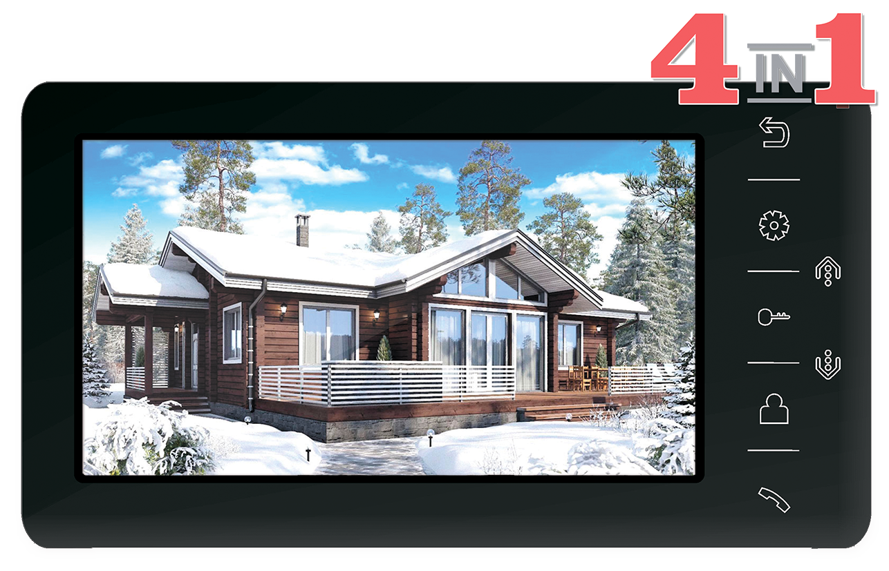 TFT, цветной, 7 дюймов, 800x480 Экран Подключение вызывных панелей и видеокамер формата AHD/CVI/TVI 1080p/ 720p или CVBS (PAL/NTSC) Сенсорные кнопки 210 х 116 х 25 мм 450 г
