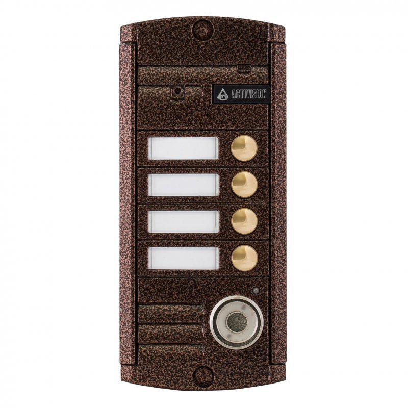 Вызывная видеопанель Activision AVP-454 (PAL) TM 4-х проводная антивандальная накладная видеопанель 4-х абонентная; с ИК подветкой до 0,6м, матрица CCD SONY, 1/3", 420 ТВл, 12В, угол обзора 75 (гор.) 55 (верт.); рабочий диапазон t -30…+55; 155х70х20мм, встроенный Touch Memory считыватель.Цветовая гамма: медь, антик