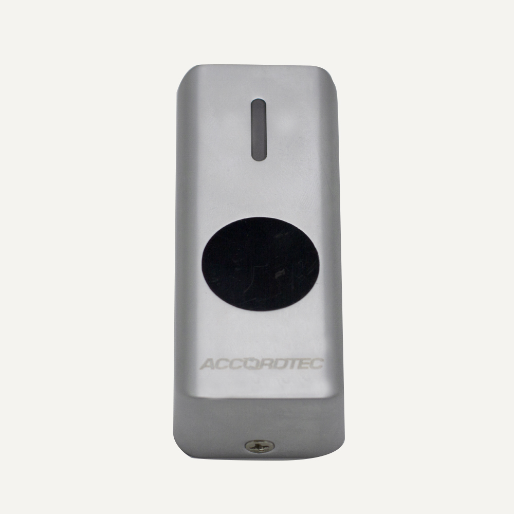 Бесконтактная накладная кнопка выхода с регулировкой дальности срабатывания от 7 до 15 см и задержки на выключение, НО/НЗ, питание 12/24 В. Коммутация 2 А, 24 В, Материал: металл. Дежурная индикация синяя, при срабатывании - зеленая. Рабочая температура: -20°С+55°С. Габариты: 80 х 32 х 23 мм; Масса брутто: 105г