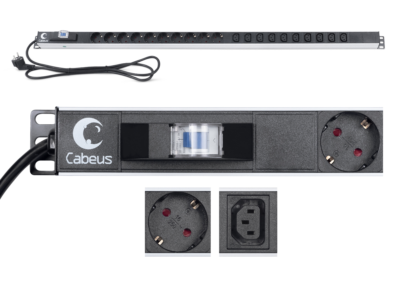 Cabeus PDU-16-10S-10C13-B Блок распределения питания для 19" шкафов, вертикальный, 10 розеток Schuko, 10 розеток IEC 320 C13, 16А, автомат защиты, алюминиевый корпус, шнур с вилкой Schuko 2 м