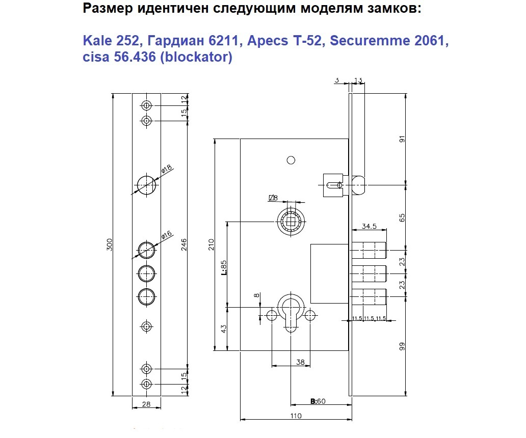 - Аналог замка Kale 252, Гардиан 6211, Apecs T-52, Securemme 2061, Cisa 56.436 (blockator)