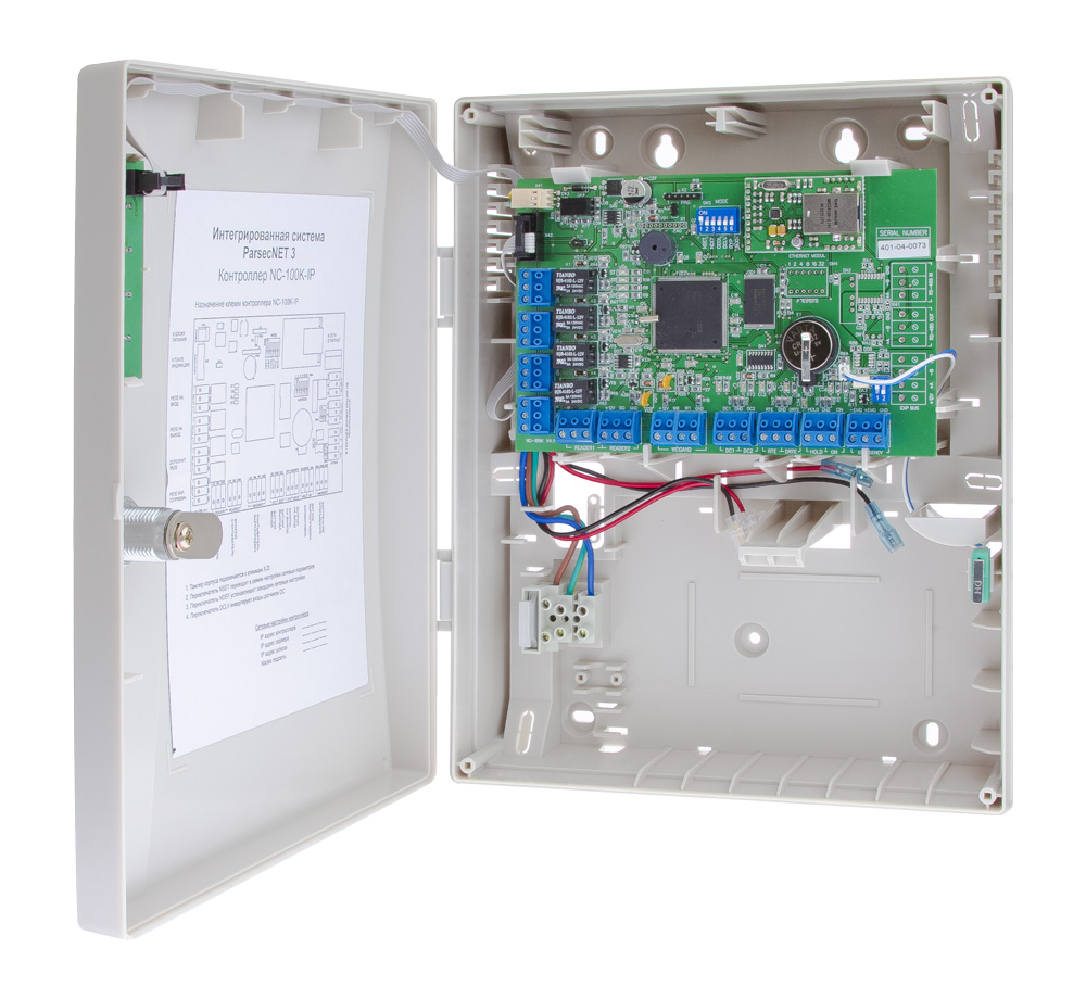 - Контроллеры NC-100K-IP поставляются в пластиковом корпусе с источником питания и местом для аккумулятора резервного питания.