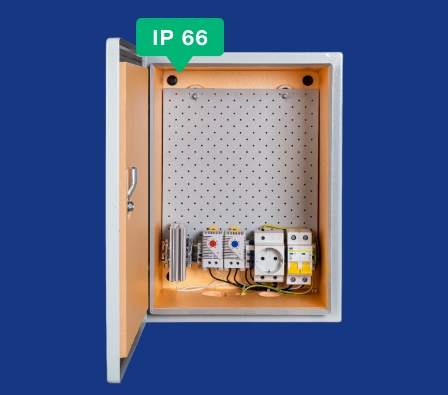 Климатический навесной шкаф Mastermann-13УТП+ (Ver. 2.0) Габариты (внешние): 400х500х250 (ШхВхГ) Габариты (внутренние): 377х477х220 (ШхВхГ) Предназначен для использования в любых климатических условиях на улице (-55°С +50°С) Комплектация: утеплитель из порилекса, замок 2 шт, ключ 1 шт, монтажная плата 1шт, гермовводы 2 шт (MG-25), розетка 1 шт, автоматический выключатель, 6А 1шт, клемма для подключения оборудования 2 шт, клемма заземления 1 шт, термореле 1шт, реле предстарта 1 шт, нагреватель мощностью 100 Вт 1шт. Вес: 10,8 кг. IP 66. Цвет ral 7035 (серый)