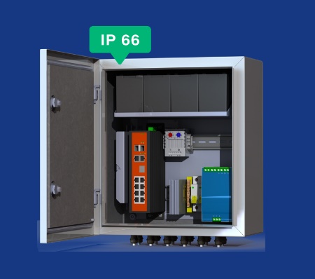Степень пылевлагозащиты IP66. Корпус стальной 1,5 мм. Настенное крепление. Входное напряжение 220В