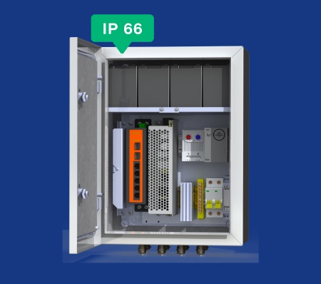 Коммутационный термошкаф Mastermann 6 УТП 4КУ ГЗ AКБ 7А IP 66 с защитным реле от "холодного пуска". Габариты (внешние): 300х400х210 мм (ШхВхГ) Предназначен для использования в любых климатических условиях на улице (-60°С +50°С) Степень пылевлагозащиты IP66. Корпус стальной 1,5 мм. Настенное крепление. Входное напряжение 220В Комплектация: Двухполюсный защитный автомат 6А - 1 шт. Обогреватель 50Вт - 1 шт. Сдвоенный термостат - 1 шт. Блок бесперебойного питания 155Вт -1 шт. Аккумулятор 12В, 7А/ч - 4 шт. Промышленный управляемый коммутатор 4*PoE 802.3 af/at (бюджет 140 Вт), 2*SFP, 1*console port - 1 шт. Оптический кросс 4 порта SC/SM - 1 шт.Устройство грозозащиты линии 220В -1 шт. Устройство грозозащиты линий PoE -1 шт. Гермовводы 4*PG9, 4*PG13,5 -1 комплект. Цвет ral 7035 (серый)