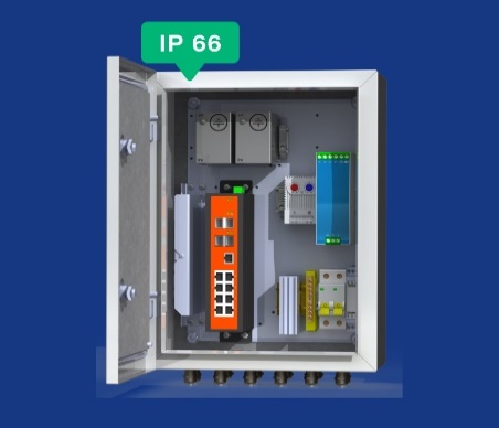 Коммутационный термошкаф Mastermann 6 УТП 8КУ ГЗ IP 66 с защитным реле от "холодного пуска". Габариты (внешние): 300х400х210 мм (ШхВхГ) Предназначен для использования в любых климатических условиях на улице (-60°С +50°С) Степень пылевлагозащиты IP66. Корпус стальной 1,5 мм. Настенное крепление. Входное напряжение 220В Комплектация: Двухполюсный защитный автомат 6А - 1 шт.Обогреватель 50Вт - 1 шт. Сдвоенный термостат - 1 шт. Блок питания 240Вт -1 шт. Промышленный управляемый коммутатор 8*PoE 802.3 af/at (бюджет 230 Вт), 4*SFP, 1*console port - 1 шт. Оптический кросс 4 порта SC/SM - 1 шт. Устройство грозозащиты линии 220В -1 шт. Устройство грозозащиты линий PoE -2 шт. Гермовводы 8*PG9, 4*PG13,5 -1 комплект. Цвет ral 7035 (серый)