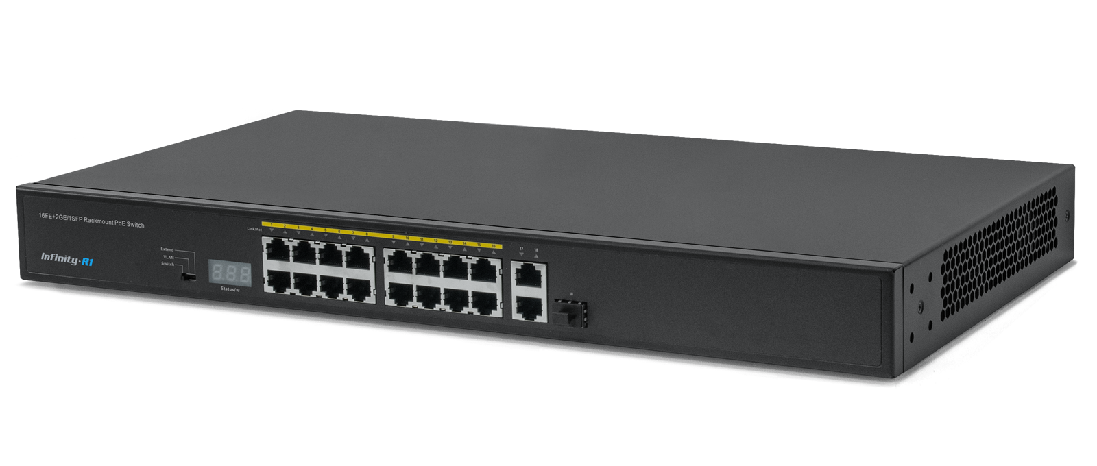 Неуправляемый коммутатор с технологией PoE для систем IP-Видеонаблюдения, 16 портов HpoE: порты 10/100M (PoE) - 16 (RJ45); порты Uplink - 2 Gigabit (RJ45) + 1 Gigabit SFP; пропускная способность - 9.2Gbps; цифровой индикатор потребляемой мощности; поддержка режимов: Switch, VLAN, Extend; стандарт PoE - IEEE 802.3af/at; рабочая температура 0º ~+45ºС; AC 200~240V 50/60HZ, 250W; 440мм × 220мм × 44мм.
