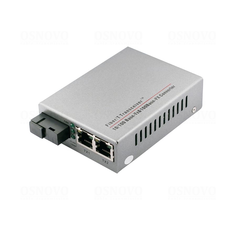 Оптический медиаконвертер Fast Ethernet. 2 медных порта(RJ45) 10/100Base-T (IEEE 802.3i, IEEE 802.3u, IEEE 802.3x), 1 оптический порт (SC, tx1550нм/rx1310нм) 100Base-FX. Дальность передачи по оптической линии до 20км (одномод, одно волокно (WDM мультиплексирование). Автоопределение MDI/MDI-X. Режимы работы: дуплекс/полудуплекс. В комплекте: БП DC5V(1A). Размеры (ШхВхГ): 70x25x93мм. Рабочая температура: 0…+60гр.С.