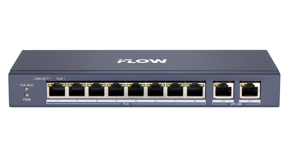L2, неуправляемый POE коммутатор I-Flow для систем видеонаблюдения, 8 портов 10/100M RJ45 PoE, 2 uplink порта с поддержкой 1000М RJ45, Поддерживаемые стандарты POE - 802.3af/at, Суммарный бюджет PoE на все порты 60 Вт, Поддержка режима передачи POE и данных до 300м при 10Мб/с, CAT6; защита от перенапряжения 6 кВ