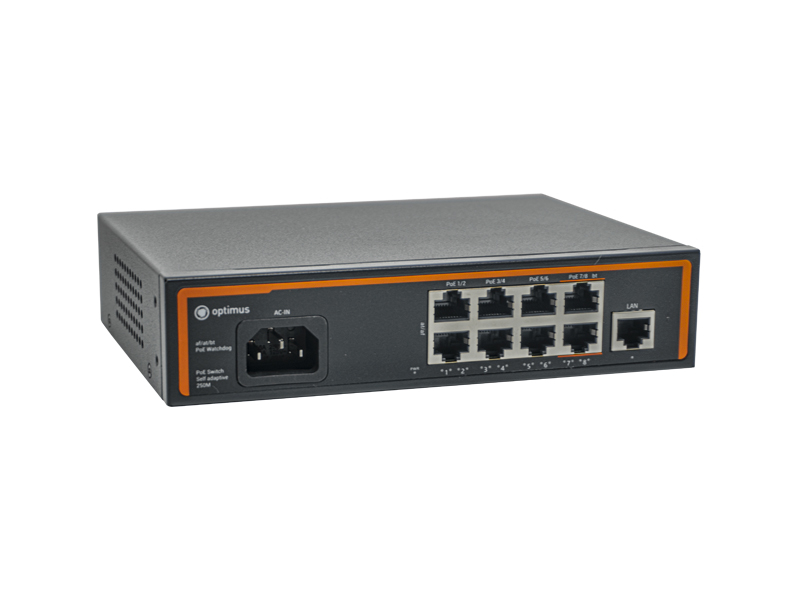 8 портов 10/100Mbps RJ-45 с поддержкой Auto-MDIX, PoE, Watchdog + 1 порт 10/100Mbps RJ-45 Uplink, PoE 1~6 Порты:1/2(+52V), 3/6(GND)≤30Вт PoE 7~8 Порты:1245(+53V), 3678(GND) Комбинированый 1/2 (+52В), 3/6(GND)≤60Вт Бюджет PoE 120 Вт, Дальность передачи до 250 метров, режимы работы коммутатора 250м/160м, Внутренний блок питания AC/DC, Вход: 90-240В, 50Гц, Выход: 52В DC, 187x139x43 мм, 730 гр. Совместим с удлинителем PoE сигнала Optimus EM1260