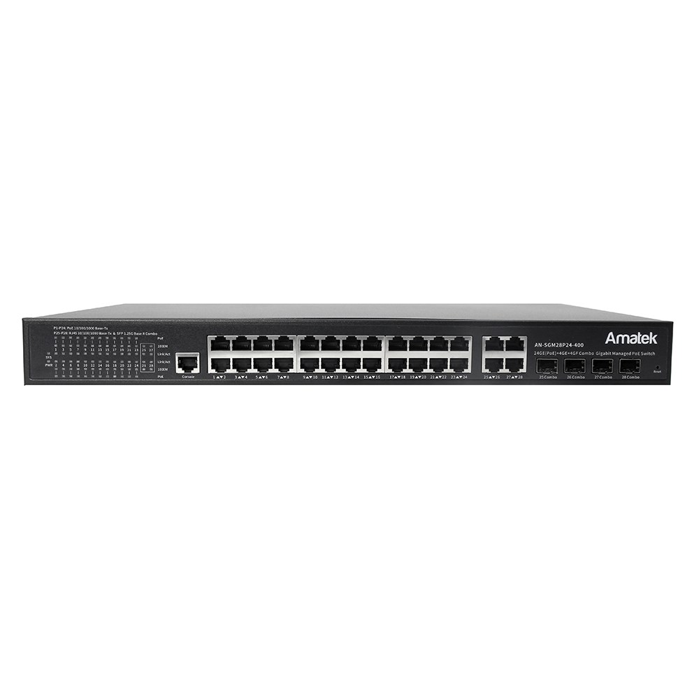 28-портовый L2 управляемый 100/1000 Мбит/с настольный/монтируемый в стойку коммутатор с PoE до 400Вт. Особенности: 24 порта 100/1000 Мбит/с с поддержкой PoE +, автосогласованием и авто-MDI/MDIX (разъёмы RJ45) 4 порта Combo (100/1000Base-T/SFP) 10/100/1000 Мбит/с, автосогласованием авто-MDI/MDIX (разъёмы RJ45) Управление: Поддержка VLAN : IEEE 802.1q (4094 VLAN ID. 256 групп VLAN). 802.1ad Q-in-Q tunneling по порту. Агрегация (объединение) каналов IEEE 802.3ad LACP: до 8 групп, каждая содержит до 8 портов. Поддержка протоколов STP: IEEE 802.1d ( STP ), IEEE 802.1w ( RSTP ), IEEE 802.1s ( MSTP ). Возможна изоляция порта, BPDU фильтрация / защита, TC/Root защита. Зеркалирование портов Качество обслуживания ( QoS ): 8 очередей вывода на каждый порт, ограничение скорости по порту / потоку, планирование очередей (WRR), классификации на основе портов (MAC, 802.1p CoS, DSCP) IGMP Snooping v1/v2/v3, IGMP querier , до 256 групп MLD (v1/v2) snooping - управление многоадресной раздачей потоков на 256 групп, использующийся в IPv6 Контроль пропускной способности (Bandwidth Control) Управление полнодуплексным потоком IEEE 802.3x. Статистика обработки пакетов по портам Управление и обслуживание: WEB-интерфейс, SNMP(v1/v2c/v3), Telnet, консольный порт Поддержка LLDP protocol Обновление прошивки TFTP или через WEB-интерфейс Импорт/экспорт файла конфигурации настроек коммутатора Безопасность: Аутентификация IEEE 802.1x Встроенный клиент RADIUS для взаимодействия с сервером RADIUS Списки контроля доступа (ACL) для ограничение доступа на основе MAC-адреса источника и назначения, IP-адреса. Протоколы безопасности: SSH, SSL, SNMP IP-MAC port binding - контроль подключения устройств в сеть на основе сочетания их IP и MAC-адресов MAC filtering - фильтрация по MAC адресам для разграничения доступа к сети Static MAC address - возможность «привязать» конкретный MAC адрес к выбранному порту DHCP Snooping и DHCP Option82 - предотвращает несанкционированные (мошеннические) действия по DHCP сервису Различные настройки безопасности BPDU Функции защиты от DoS-атак Инспекция ARP - предназначена для предотвращения ARP spoofing/poisoning атак IP Source Guard - ограничение трафика через интерфейс коммутатора Широкие возможности по настройке SNMP MIBs Power over Ethernet ( PoE ): 24 порта PoE +, позволяющие передавать питание и данные по одному кабелю Поддержка потребляемой мощности до 30 Вт для каждого PoE -порта Перераспределение мощности между портами в зависимости от потребления нагрузки Общая потребляемая мощность 400 Вт для всех PoE -портов Поддержка PoE -устройств на базе стандартов IEEE 802.3 at/af WatchDog – функция контроля зависания, подключенных к коммутатору устройств, с последующим их перезапуском (перезагрузкой). Коммуникации Гигабитные 1000Base-T порты Ethernet со слотами SFP обеспечивают высокоскоростную передачу данных, обеспечивающими дополнительные возможности для расширения сети или подключения устройств записи на большое количество камер 4 порта Combo (RJ45/SFP) позволяет соединять коммутатор по медным или оптическим линиям передачи данных. Слоты SFP позволяет устанавливать SPF модули: 1000Base-SX: 62.5/50мкм многомодовое волокно (MMF) от 2 до 550 метров. 1000Base-LX: 62.5/50мкм многомодовое волокно (MMF) от 2 до 550 метров или 10мкм одномодовое волокно (SMF) от 2 до 5000 метров. 1000Base-EX: одномодовое волокно (SMF) до 40 км, (1310 нм). 1000Base-ZX: одномодовое волокно (SMF) до 70 км, (1550 нм) 1 консольный порт (RJ45) Для подключения по оптоволоконному кабелю необходим SFP модуль (в комплект не входит). Коммутация: Коммутационная способность 64 Гбит/с 16K записей в таблице MAC-адресов с возможностью автоматического запоминания и автоматической