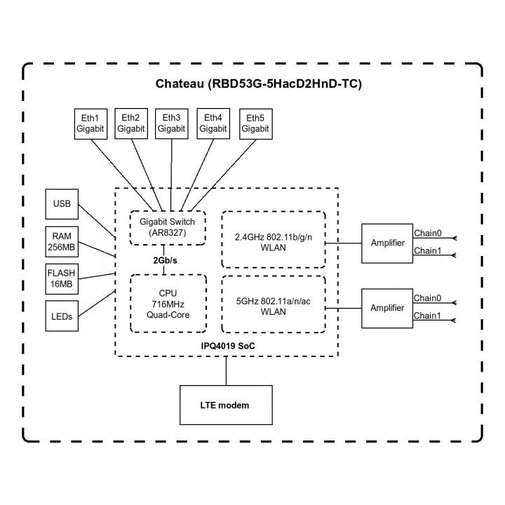 Имеет LTE/3G-модуль 6-й категории способный достигать до 300 Мбит/с макс.пропускной способности! Также устройство оснащено 5-ю Ethernet-портами 1 Гбит/с, слотом для microSIM карт, а также полноразмерным портом USB 2.0.