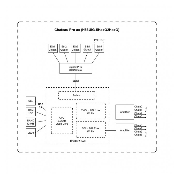 Технические характеристики Процессор IPQ-8072A, 2208 МГц, 4 ядра, архитектура ARM (64 бит) ОЗУ 1 ГБ DDR3 RAM ПЗУ 128 МБ NAND Сетевой интерфейс 5х 10/100/1000 Мбит/с Ethernet Число Ethernet-портов 1 Гбит/с с PoE-Out 1 Дополнительные интерфейсы 1x USB 3.0 тип А, макс.