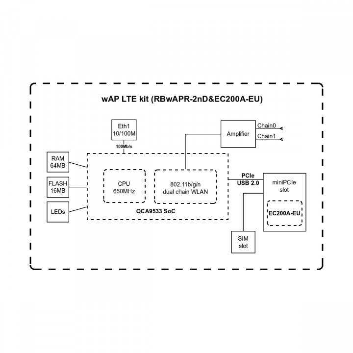 Технические характеристики Процессор QCA9531, 1 ядрo, архитектура MIPSBE Номинальная частота процессора 650 МГц ОЗУ 64 МБ DDR2 RAM ПЗУ 16 МБ FLASH Проводной сетевой интерфейс 1х 10/100 Мбит/с Ethernet Дополнительные интерфейсы 1x mini-SIM для модема 1x miniPCI-e Число входов постоянного тока 3 (DC Jack, PoE-In или автомобильный разъём) Питание на входе 9–30 В (DC Jack) 9–30 В (PoE-In) 9–30 В(автомобильный разъём) Максимальный ток при минимальном напряжении: 0,54 А Максимальный ток при максимальном напряжении: 0,23 А PoE-In Passive PoE Максимальное энергопотребление 7 Вт Размеры 185 x 85 x 30 мм Температура окружающей среды рабочая -40..
