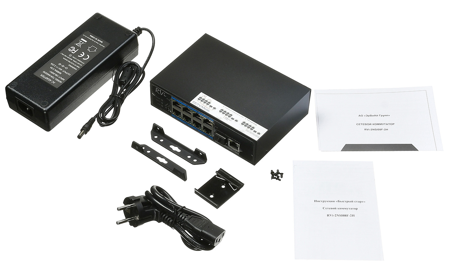 В комплекте с RVi-2NSI08F-2H поставляются адаптеры для установки коммутатора в шкаф на DIN рейку или на вертикальную поверхность.