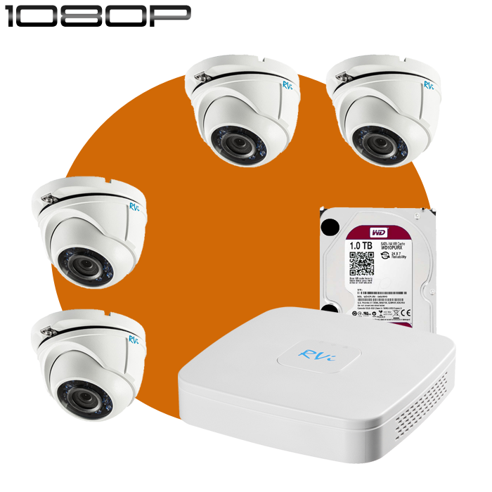 В комплект входят: 4 купольные антивандальные камеры с разрешением FULL-HD. 4-канальный видеорегистратор с подключением к любым смартфонам на базе IOS или ANDROID. Жесткий диск объемом 500Гб.