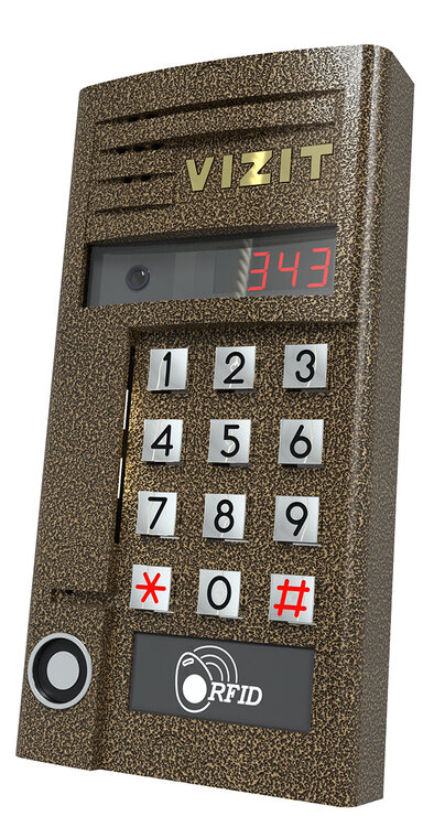Блок вызова для совместной работы с БУД-302х, -430х, -485х. Встроенный считыватель ключей VIZIT-ТМ и VIZIT-RF2. Светодиодный дисплей. Подсветка клав