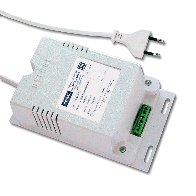 Блок питания ЦИФРАЛ БП-1 БЛОК ПИТАНИЯ (Cyfral) - Выходные напряжения: =12 В/0,6 А; =15 В/0,6 А; ~15 В/0,3 А.Имеет в составе выпрямитель на 15 В и стабилизатор на 12 В. Предохранитель в каждой цепи. Типовой пластмассовый корпус.