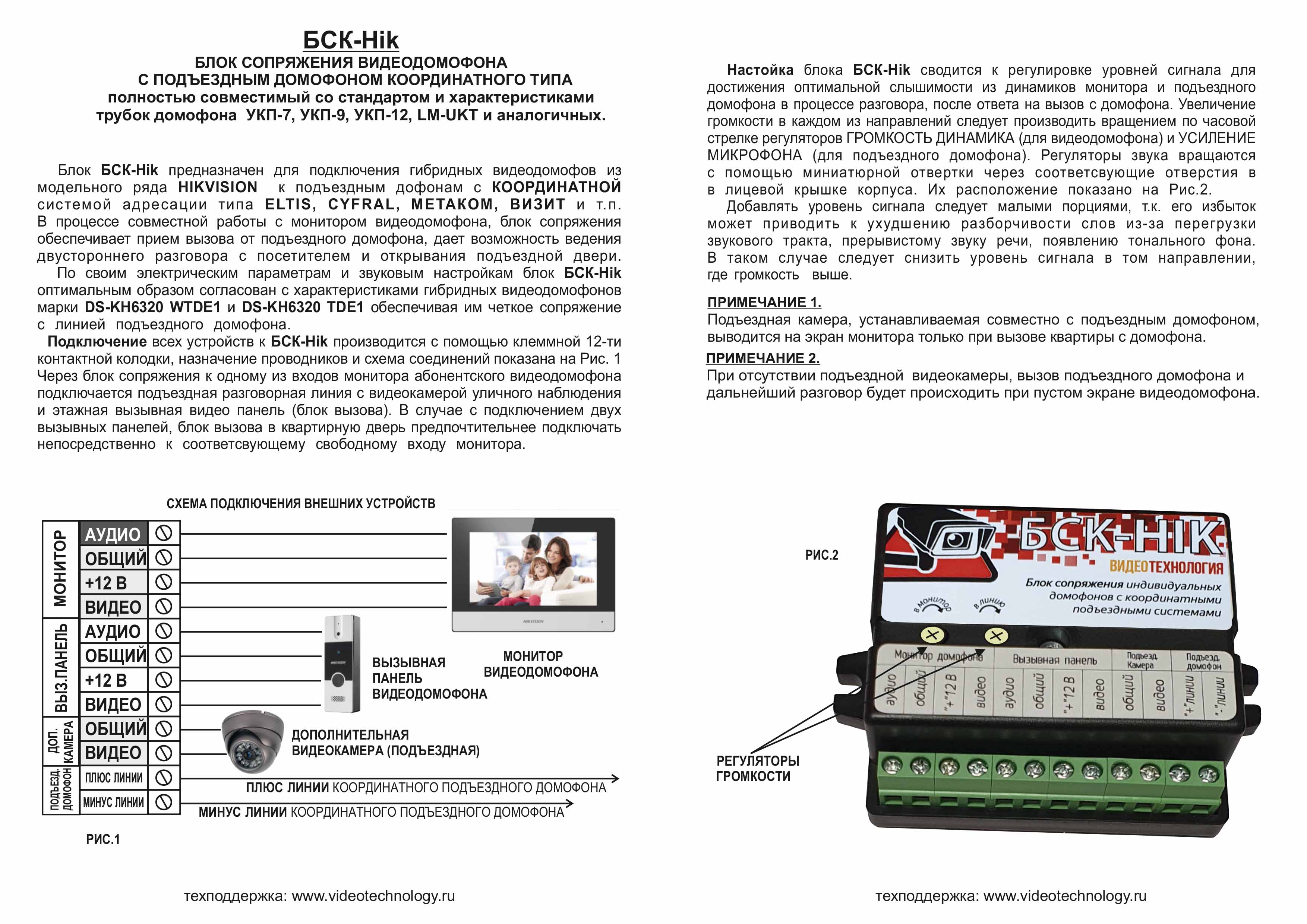 При помощи блока сопряжения БСK-HIK вы можете подключить ваш квартирный видеодомофон Hikvision/I-Flow DS-KH6320-WTDE1 или DS-KH6320-TDE1, а так же Hiwatch VDP-H3212W и VDP-H3212WB к линии подъездного домофона.
