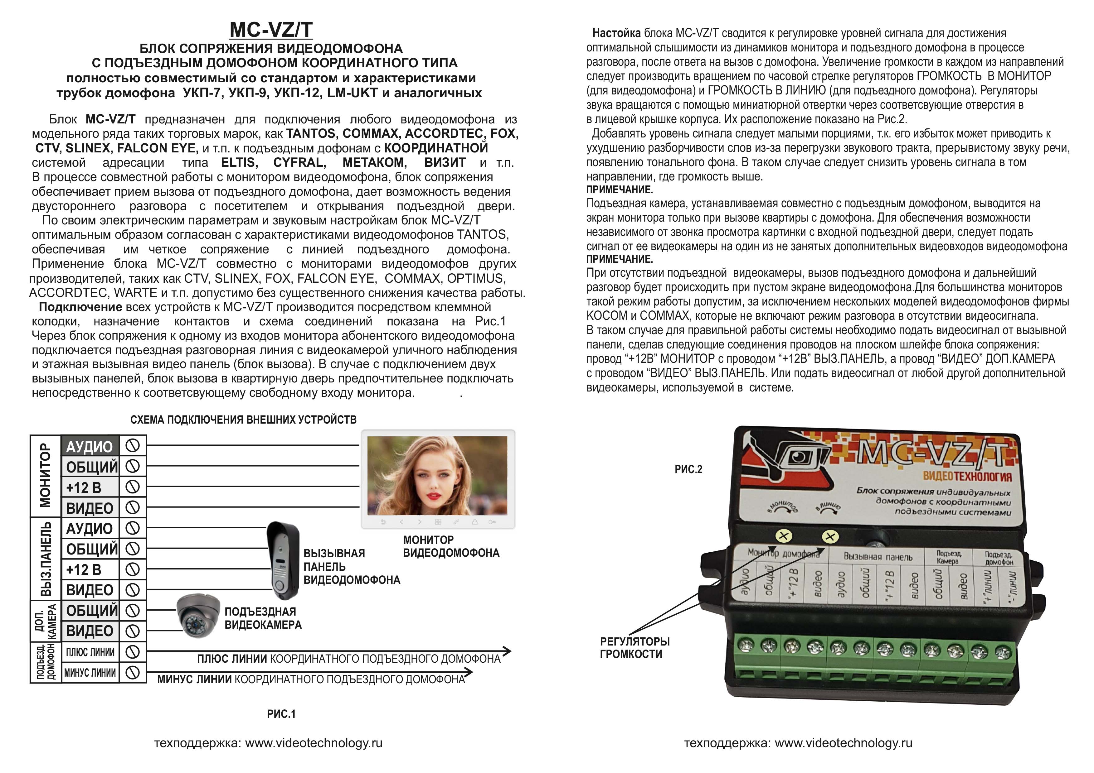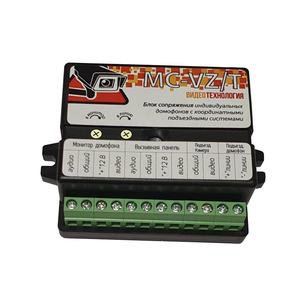 Блок MC-VZ/T позволяет подключить любой видеодомофон к подъездному домофону. Встроенная защита от помех на линии домофона Гальваническая развязка с линией подъездного аудо домофона Подключение к подъездным домофонам координатного типа ELTIS VIZIT METAKOM РОСТЕЛЕКОМ (координатный) CYFRAL Универсальный способ подключения - КЛЕМЫ / ШЛЕЙФ S-1 Поддерживает подключение видеодомофонов TANTOS COMMAX CTV OPTIMUS ALTCAM FALCON EYE SLINEX MAJOR WARTE FOX