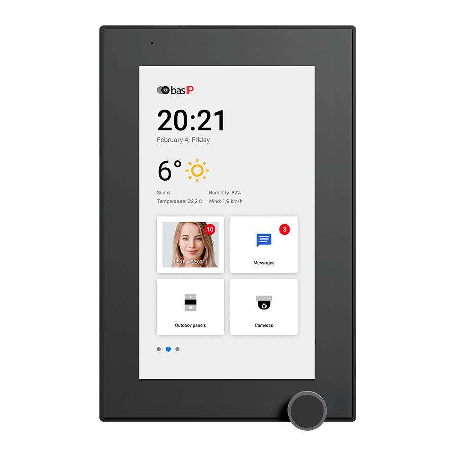 7 дюймовый IP видеодомофон с настенным горизонтальным и вертикальным монтажом, возможностью управления лифтом, выводом сообщений от управляющей компании, PoE, подключением 32 камер, памятью для фото/видео и автоответчиком. ОС — Android.