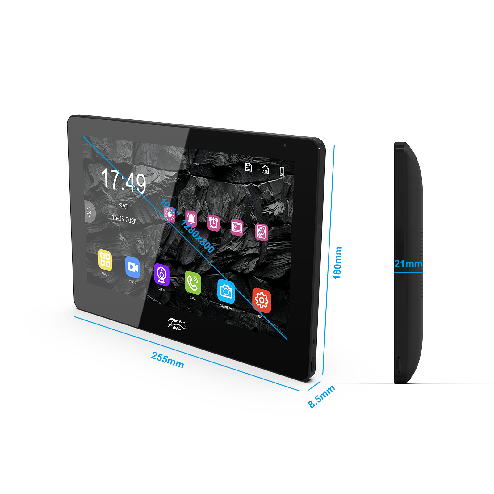 Размер экрана 8" IPC LCD Разрешение IPS LCD 1280*800 Touch Screen Формат поддерживаемого видео сигнала H.264/H.265 Интерфейс До 7ми IP устройств до 5МП Аудио Звуковая система Встроенные микрофон и динамик, Голосовой автоответчик Интерком Есть. До 10-ти устройств Запись Встроенная память Нет Поддержка MicroSD Class 10, до 512 Гб Функции Кнопки управления Сенсорные Управление замком Панель/ Ворота, Управление вторым замком через панель