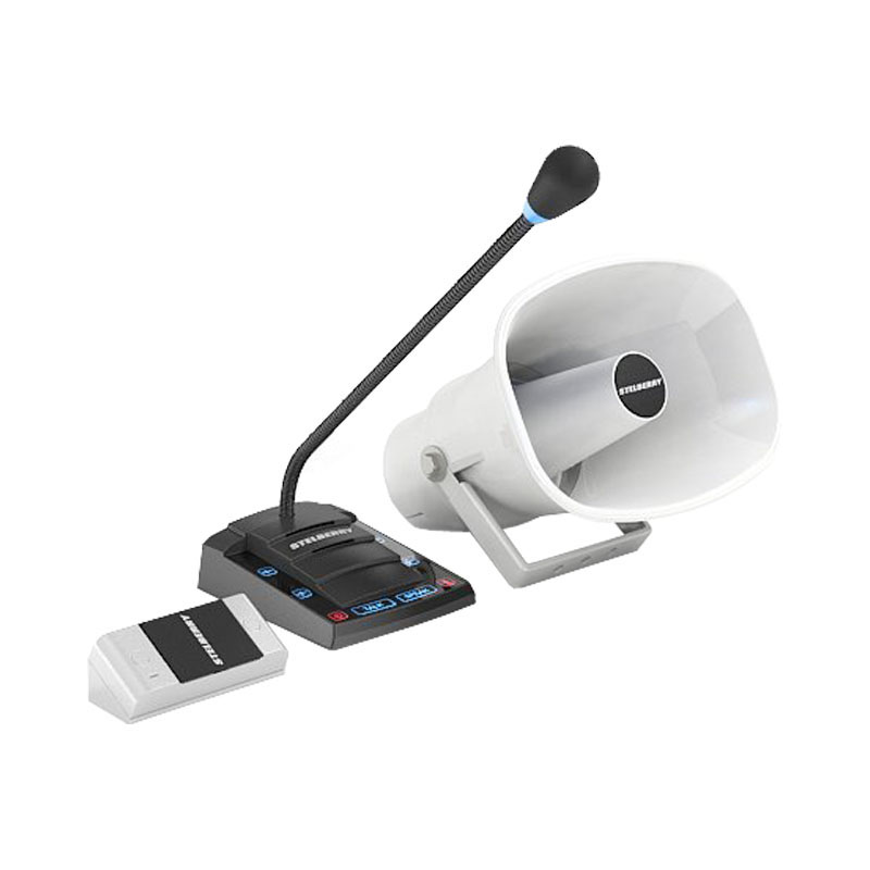 Комплект переговорного устройства клиент-кассир для АЗС с системой громкого оповещения, функцией "симплекс", встроенным усилителем, рупором на 15 Ватт и выходом для записи переговоров. Рупор идёт в комплекте с 15 метрами кабеля. Панель клиента, угловое крепление панели и блок питания в комплекте.