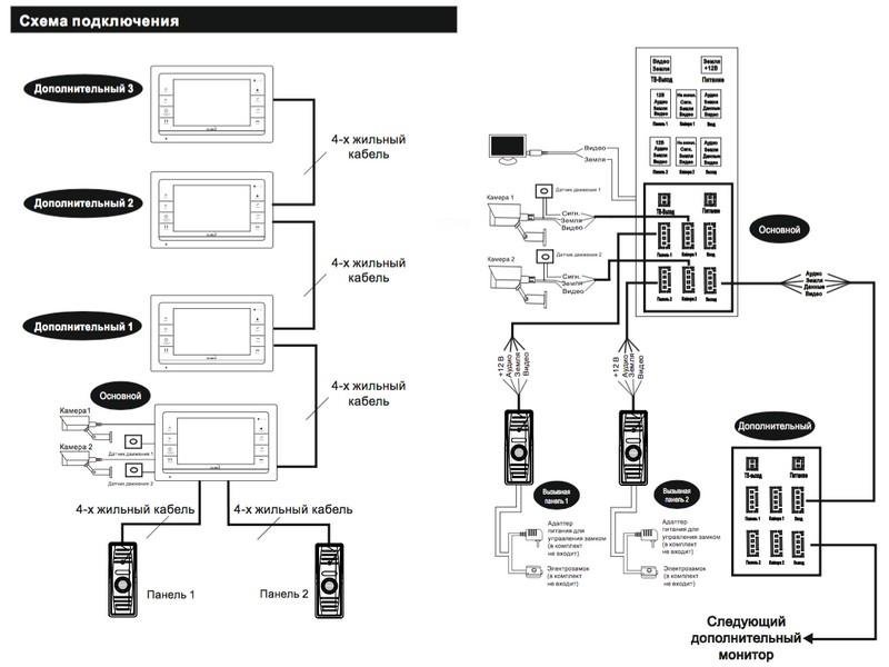 | Интерком | SL-10IP, SL-10M, SL-07IP, SL-07M, SQ-07MT, SM-07M, SM-04M, MS-04, в интеркоме до 4-х мониторов. Мониторы SL-10IP и SL-07IP могут быть только основными при соединении в интеркоме |