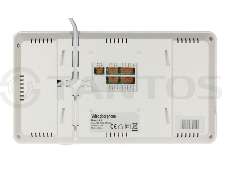 Видеодомофон Tantos Neo с семи дюймовым экраном передает цветное изображение в расширении 800 на 480 пикселей. Устройство устанавливается накладным способом на стену. Вес оборудования составляет 470 грамм, размер 210 мм х 116 мм х 25 мм. В системе предусмотрено 4 монитора, а также подключение двух панелей вызова и камер наблюдения. Также, чтобы улучшить качество передаваемого изображения, в оборудовании предусмотрена матрица. В режиме ожидания видеодомофон может использоваться как рамка для отображения фотографий.