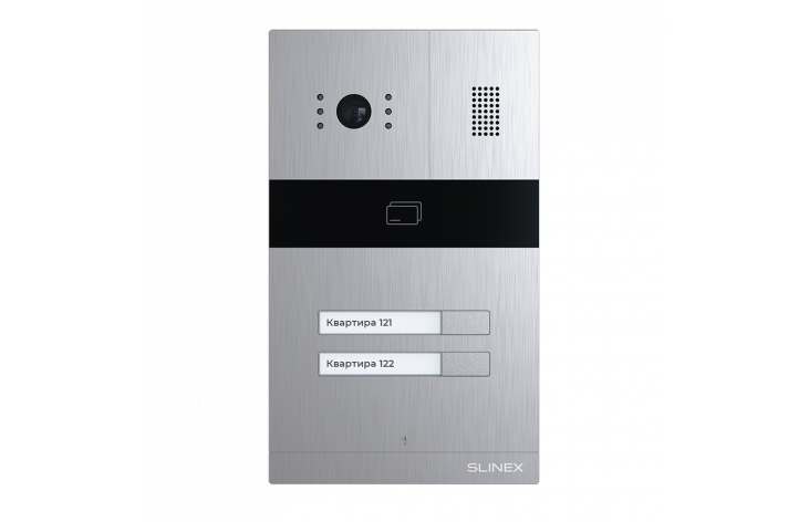 AHD вызывная видеопанель на 2 абонента со встроенным контроллером и комбинированным считывателем бесконтактных карт. Цветная матрица CMOS, разрешение 2,0 Мп (AHD) / 1 Мп (AHD) / 960 ТВЛ (CVBS), угол обзора: 115° по горизонтали, минимальная освещенность: 0,01 Люкс (ИК подсветка до 1,5 м). Кнопка переключение режима камеры. Механический ИК фильтр. Встроенный комбинированный считыватель бесконтактных карт: EM-Marin и Mifare. Количество идентификаторов: 248 шт. Выход Wiegand-26. Подсветка именных табличек абонентов. НО/НЗ контакт реле для подключения электромеханического или электромагнитного замка. Возможность подключить любой 4-х проводной домофон. Класс защищенности: IP65, температура эксплуатации: -40...+65 °С. Питание: +12 В (от монитора). Размеры: 110×186×32 мм. Врезная установка. Цветовые решения: серебро