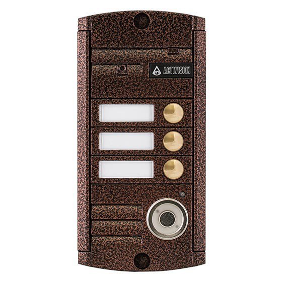 4-х проводная; антивандальная накладная видеопанель 3-х абонентная; с адаптивной ИК подветкой и датчиком освещенности и дальностью до 0,6м, матрица 1/3", 1000 ТВл, 12В, угол обзора 75 (гор.) 55 (верт.); рабочий диапазон t -50…+50; 140х70х20 мм, встроенный Touch Memory считыватель. Цветовая гамма: медь, антик