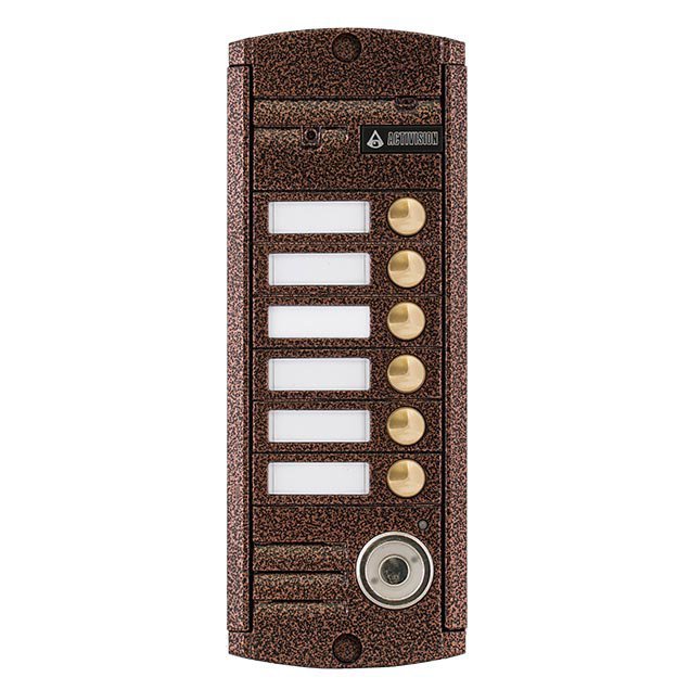 Антивандальная цветная видео панель нового образца на шестерых абонентов системы PAL со встроенным контроллером touch memory (TM). Исполнение корпуса в современном дизайне для "накладной" установки из прочного алюминиевого сплава, покрытого ударопрочной порошковой краской. Обладает дополнительной влагозащитой и антикорозийностью. Вызывная панель данной модели сохраняет работоспособность при критических перепадах температуры среды ее применения. Кнопки вызова способны выдерживать фронтальные удары благодаря особенностям внутренней конструкции. Так же в ней реализована инновационная система интеллектуальной подсветки лица гостя, регулирующаяся в зависимости от дальности его расположения. Цветовая гамма состоит из двух цветов: серебряный антик и медный антик. Разработана и производится в России с 2014 года.