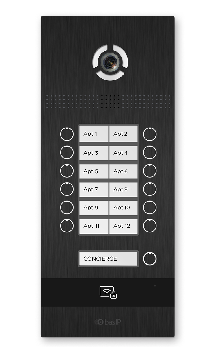 Многокнопочная IP вызывная панель на 12 абонентов с 3D распознаванием лиц. BI-12FB доступна в золотом, серебряном и черном цветах.