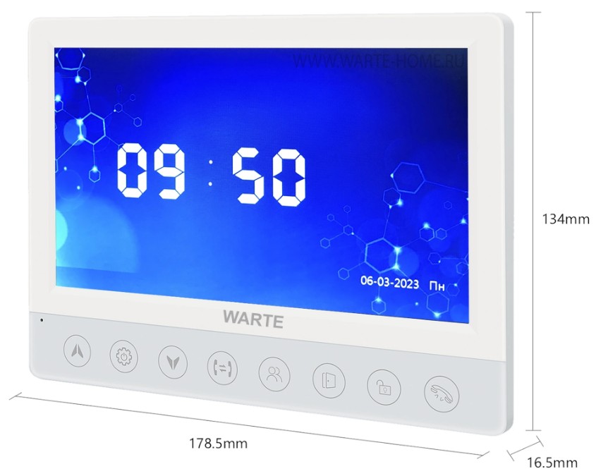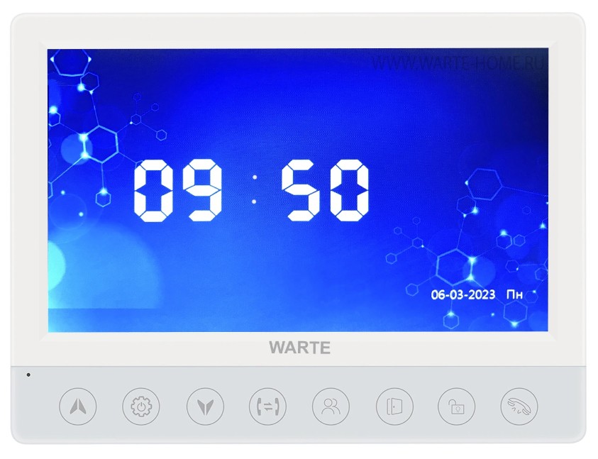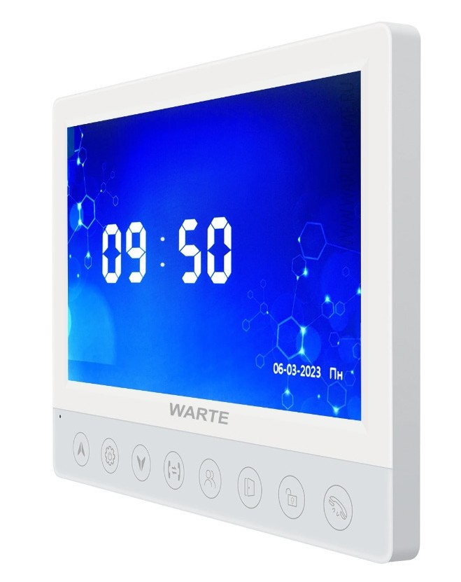 Видеодомофон WARTE-DM7-02M PAL белый (КВАРТЕТ) 7" CVBS (PAL/NTSC). Функция видеозаписи по вызову и детекции движения, фоторамка, часы, mp3 мелодии. Подключение до: 4 вызывные панели или видеокамеры + 5 видеодомофонов WARTE-DM7-02M + автоматика для ворот. 178х134х16мм. Материал корпуса – пластик, акриловое стекло.