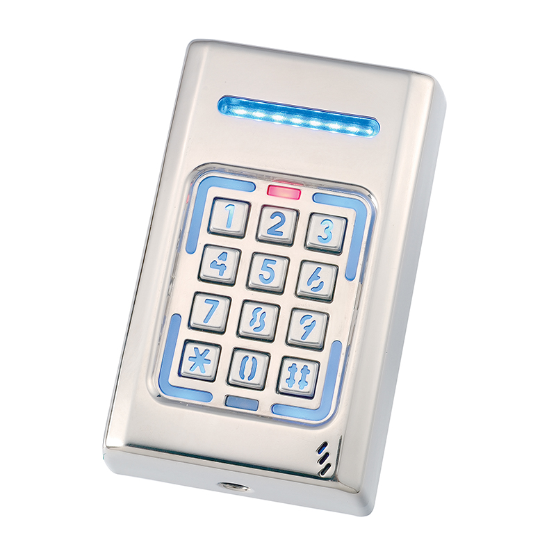 Накладная кодовая панель со встроенным Em-marin считывателем (Wiegand 26/34бит). Автономный контроллер на 2000 карт. До 8 пользовательских кодов доступа. Корпус - влагозащищенный (IP62), нержавеющая сталь, кнопки - металлизированные, с подсветкой. Световая и звуковая индикация. Тревожный выход на сигнализацию. 4 режима открывания: по коду, по карте, по карте и коду, по карте или коду. Питание: 12В, 120 мА в режиме ожидания, 150 мА в режиме работы. Габариты:115х70х30,5 мм.