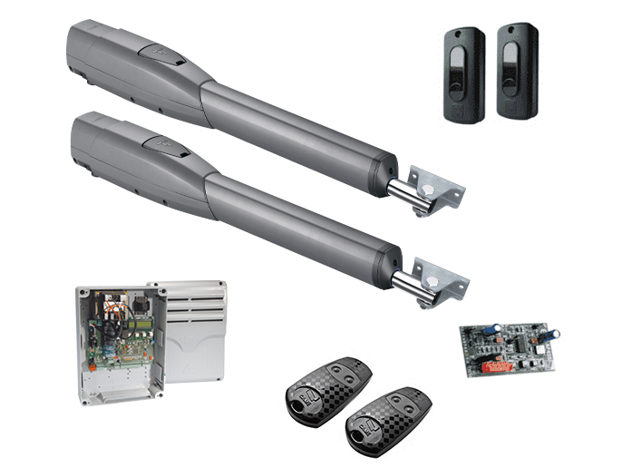 Комплект автоматики для распашных ворот со створками шириной до 3 м, 230 В. Самоблокирующийся линейный привод ATS30AGS со встроенными концевыми выключателями (2шт); блок управления ZF1N (1шт); плата-радиоприемник AF43S (1шт); комплект фотоэлементов DIR10 (1шт); брелок-передатчик AT04EV (2шт).