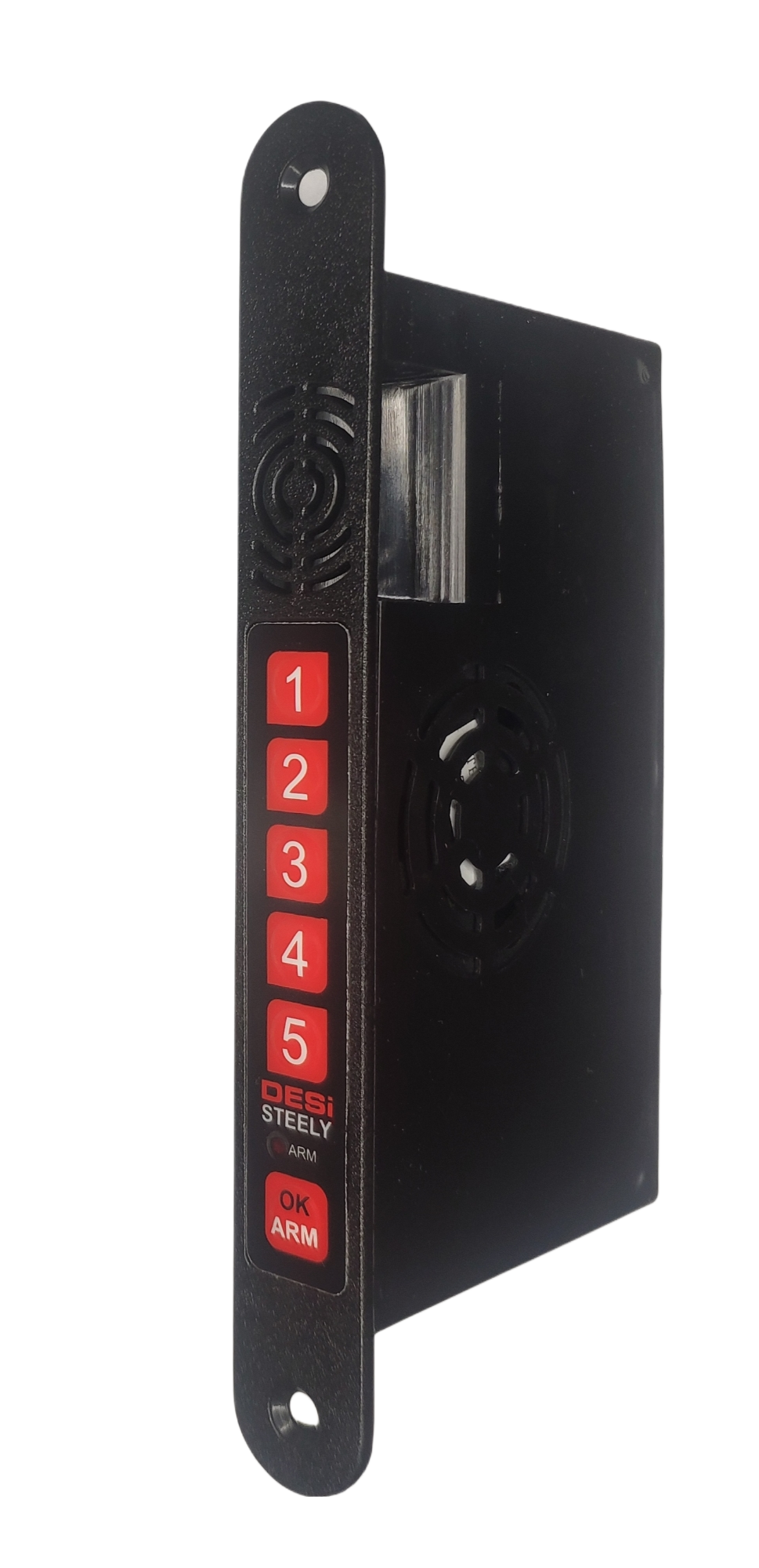 Срабатывает на вибрации или несанкционированное открытие двери. Издает звуковой сигнал 105 дБ. Снятие или постановка сигнализации при помощи пульта управления или кодовой панели.
